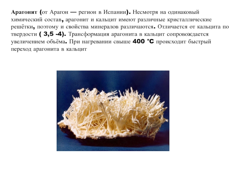 Слайд 22Арагонит (от Арагон — регион в Испании). Несмотря на одинаковый химический