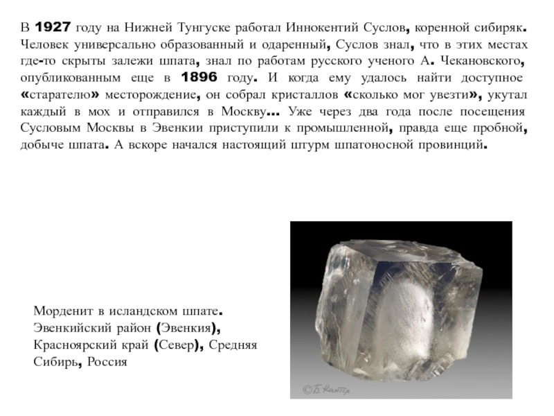 этих местах где-то скрыты залежи шпата, знал по работам русского ученого А. Чекановского, опубликованным еще в 1896 году. И когда ему удалось найти доступное «старателю» месторождение, он собрал кристаллов «сколько мог увезти», укутал каждый в мох и отправился в Москву… Уже через два года после посещения Сусловым Москвы в Эвенкии приступили к промышленной, правда еще пробной, добыче шпата. А вскоре начался настоящий штурм шпатоносной провинций.