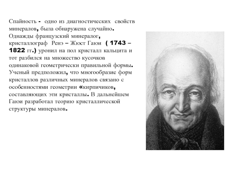 Слайд 8Спайность - одно из диагностических свойств минералов, была обнаружена случайно.