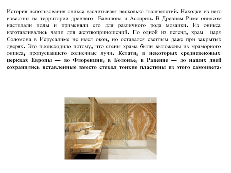 настилали полы и применяли его для различного рода мозаики. Из оникса изготавливались чаши для жертвоприношений. По одной из легенд, храм царя Соломона в Иерусалиме не имел окон, но оставался светлым даже при закрытых дверях. Это происходило потому, что стены храма были выложены из мраморного оникса, пропускавшего солнечные лучи. Кстати, в некоторых средневековых церквах Европы — во Флоренции, в Болонье, в Равенне — до наших дней сохранились вставленные вместо стекол тонкие пластины из этого самоцвета.
