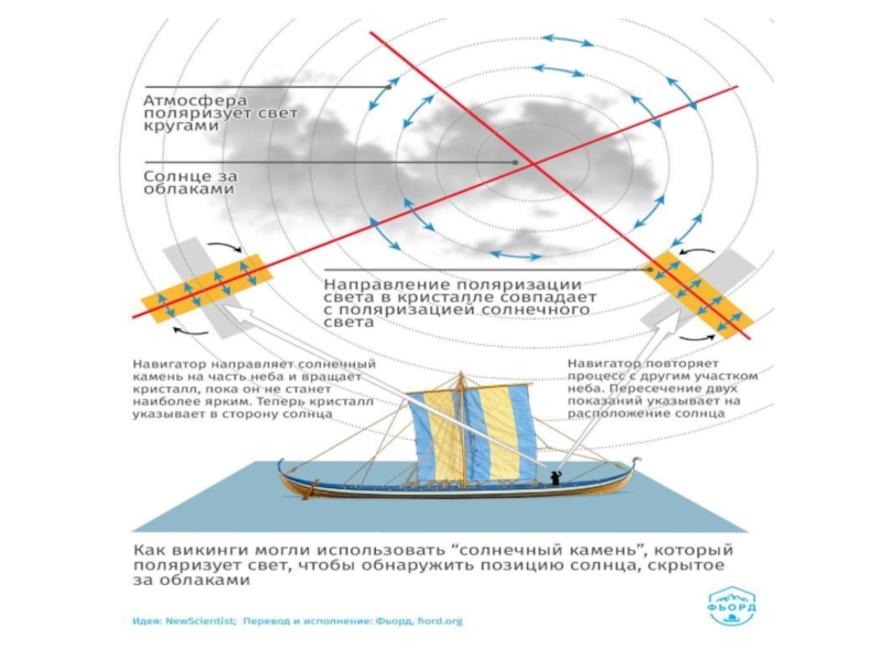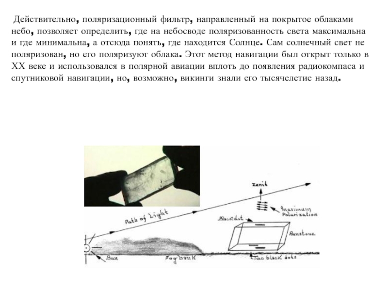 а отсюда понять, где находится Солнце. Сам солнечный свет не поляризован, но его поляризуют облака. Этот метод навигации был открыт только в ХХ веке и использовался в полярной авиации вплоть до появления радиокомпаса и спутниковой навигации, но, возможно, викинги знали его тысячелетие назад.