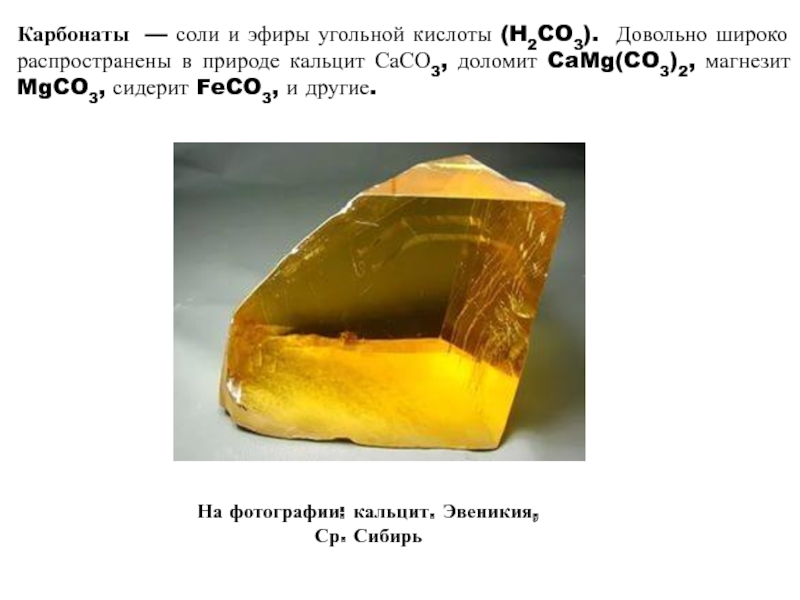 Слайд 2Карбонаты — соли и эфиры угольной кислоты (H2CO3). Довольно широко
