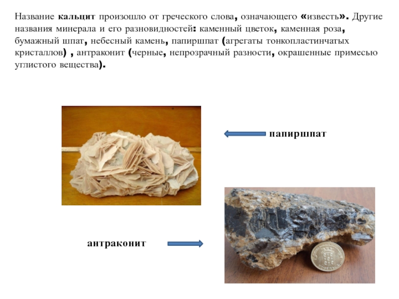 Слайд 5Название кальцит произошло от греческого слова, означающего «известь». Другие названия