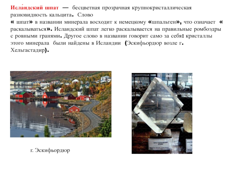 « раскалываться». Исландский шпат легко раскалывается на правильные ромбоэдры с ровными гранями. Другое слово в названии говорит само за себя: кристаллы этого минерала были найдены в Исландии (Эскифьордюр возле г. Хельгастадир).