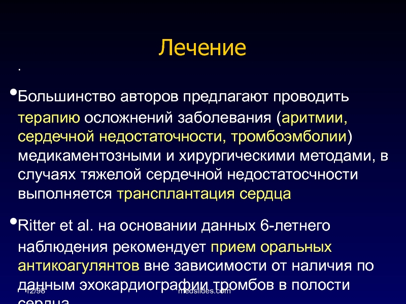 Ritter et al. на основании данных 6-летнего наблюдения рекомендует прием оральных антикоагулянтов вне зависимости от наличия по данным эхокардиографии тромбов в полости сердца