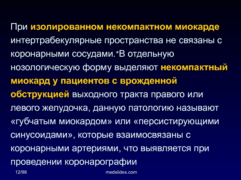 врожденной обструкцией выходного тракта правого или левого желудочка, данную патологию называют «губчатым миокардом» или «персистирующими синусоидами», которые взаимосвязаны с коронарными артериями, что выявляется при проведении коронарографии