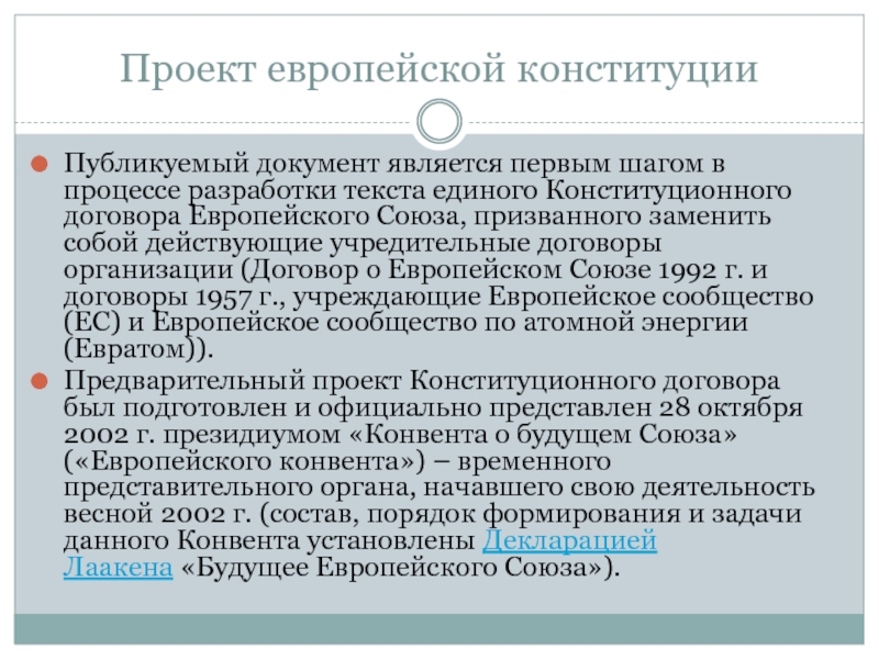 Предварительный проект Конституционного договора был подготовлен и официально представлен 28 октября 2002 г. президиумом «Конвента о будущем Союза» («Европейского конвента») – временного представительного органа, начавшего свою деятельность весной 2002 г. (состав, порядок формирования и задачи данного Конвента установлены Декларацией Лаакена «Будущее Европейского Союза»).