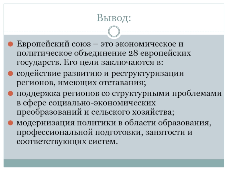 Вывод:Европейский союз – это экономическое и политическое объединение 28 европейских государств. Его цели заключаются в:содействие развитию и
