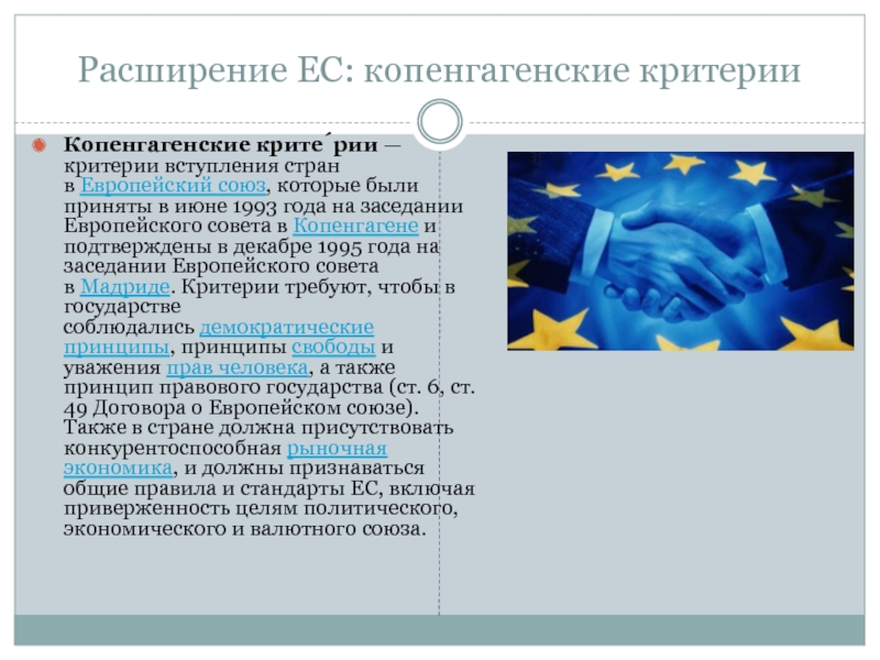 Расширение ЕС: копенгагенские критерииКопенгагенские крите́рии — критерии вступления стран в Европейский союз, которые были приняты в июне 1993 года