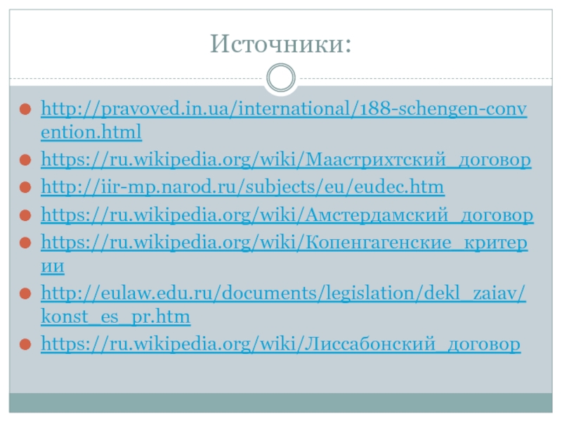 Источники:http://pravoved.in.ua/international/188-schengen-convention.htmlhttps://ru.wikipedia.org/wiki/Маастрихтский_договорhttp://iir-mp.narod.ru/subjects/eu/eudec.htmhttps://ru.wikipedia.org/wiki/Амстердамский_договорhttps://ru.wikipedia.org/wiki/Копенгагенские_критерииhttp://eulaw.edu.ru/documents/legislation/dekl_zaiav/konst_es_pr.htmhttps://ru.wikipedia.org/wiki/Лиссабонский_договор