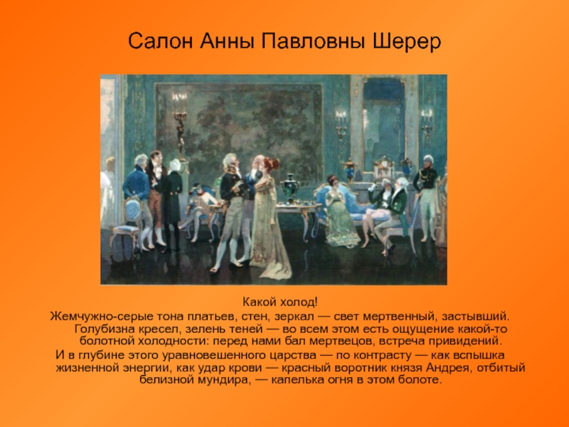 И в глубине этого уравновешенного царства — по контрасту — как вспышка жизненной энергии, как удар крови — красный воротник князя Андрея, отбитый белизной мундира, — капелька огня в этом болоте.