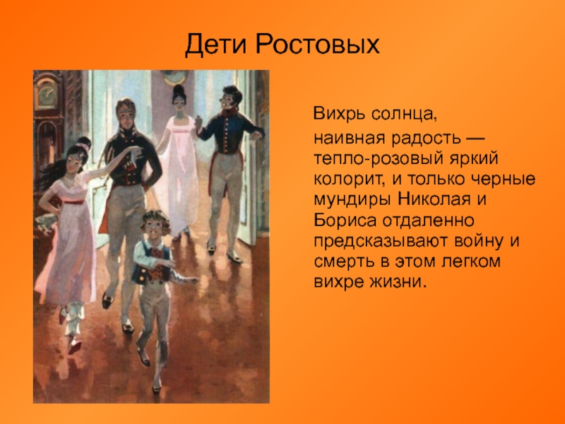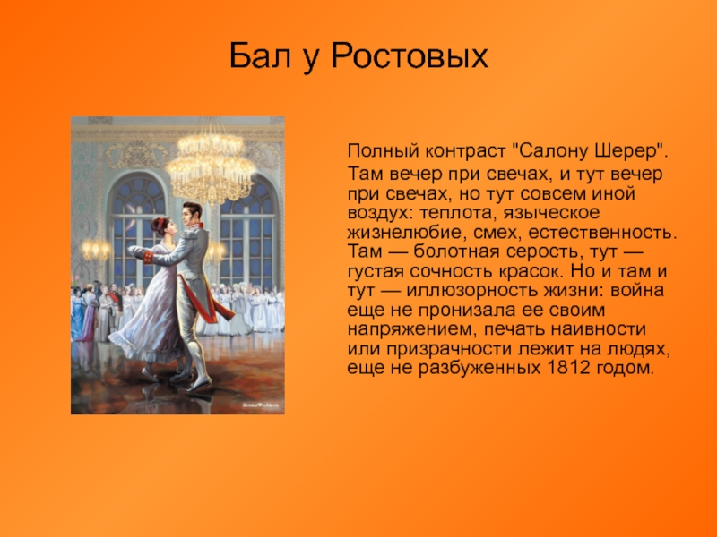 при свечах, но тут совсем иной воздух: теплота, языческое жизнелюбие, смех, естественность. Там — болотная серость, тут — густая сочность красок. Но и там и тут — иллюзорность жизни: война еще не пронизала ее своим напряжением, печать наивности или призрачности лежит на людях, еще не разбуженных 1812 годом.