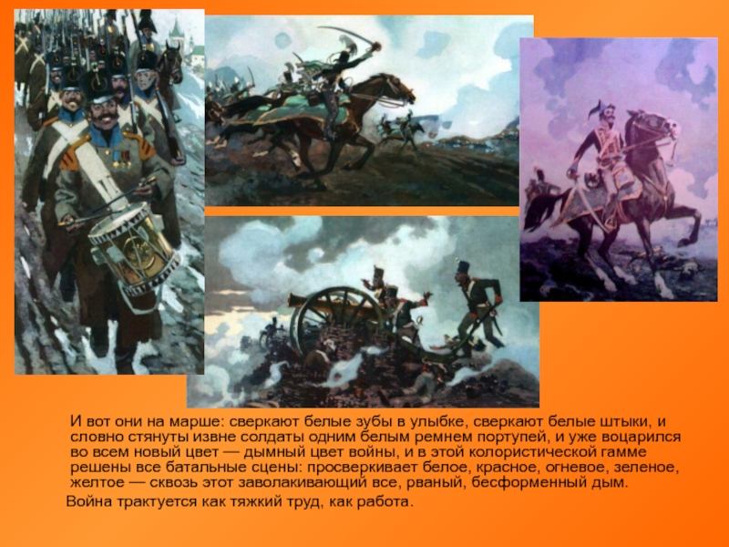 солдаты одним белым ремнем портупей, и уже воцарился во всем новый цвет — дымный цвет войны, и в этой колористической гамме решены все батальные сцены: просверкивает белое, красное, огневое, зеленое, желтое — сквозь этот заволакивающий все, рваный, бесформенный дым.