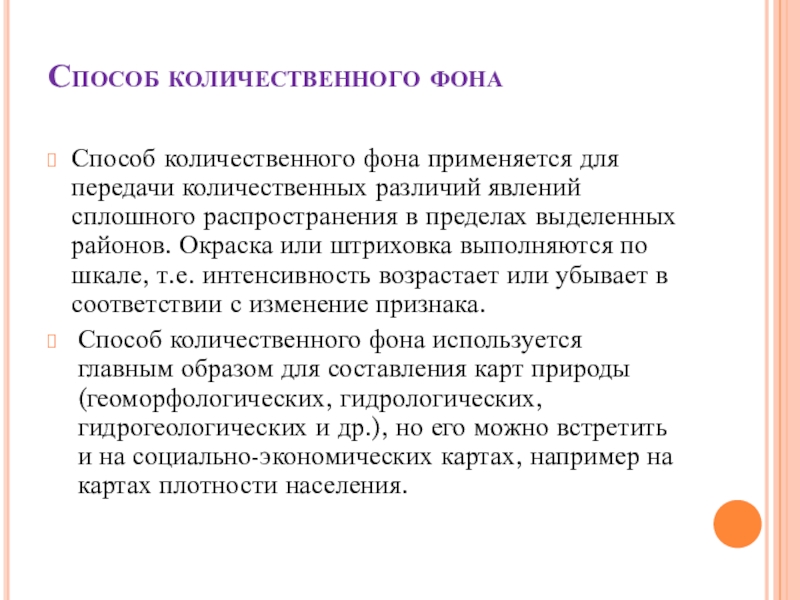 Способ количественного фона используется главным образом для составления карт природы (геоморфологических, гидрологических, гидрогеологических и др.), но его можно встретить и на социально-экономических картах, например на картах плотности населения.