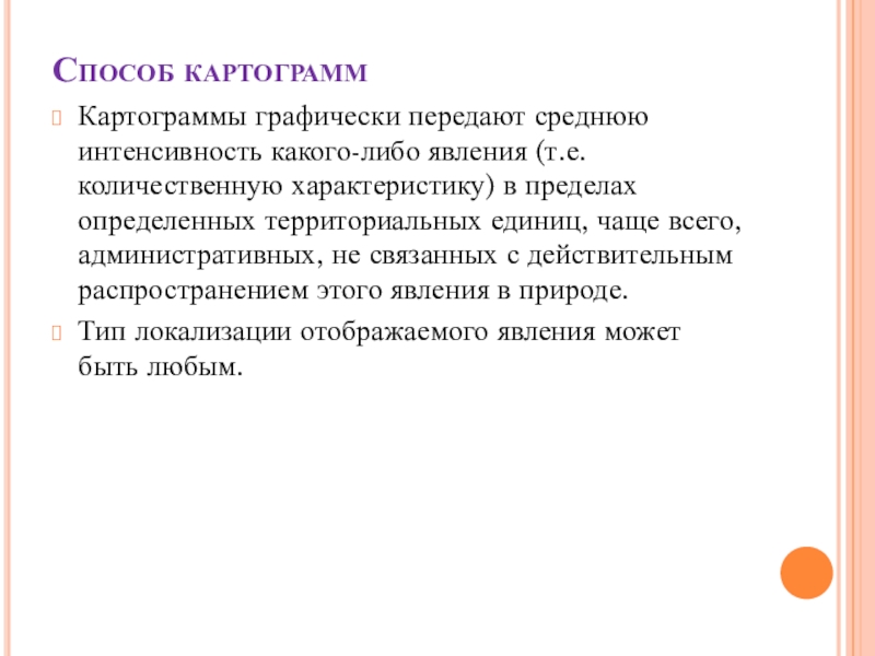- как правило, не несет информации о конкретных качественных и количественных характеристиках, а отображает форму и местоположение площади распространения картографируемого явления.