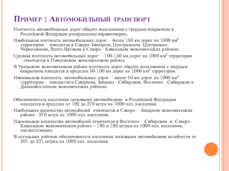 Наименьшая плотность автомобильных дорог - менее 50 км дорог на 1000 км2 территории - находится в Северном, Западно - Сибирском, Восточно - Сибирском и Дальневосточном экономических районах.