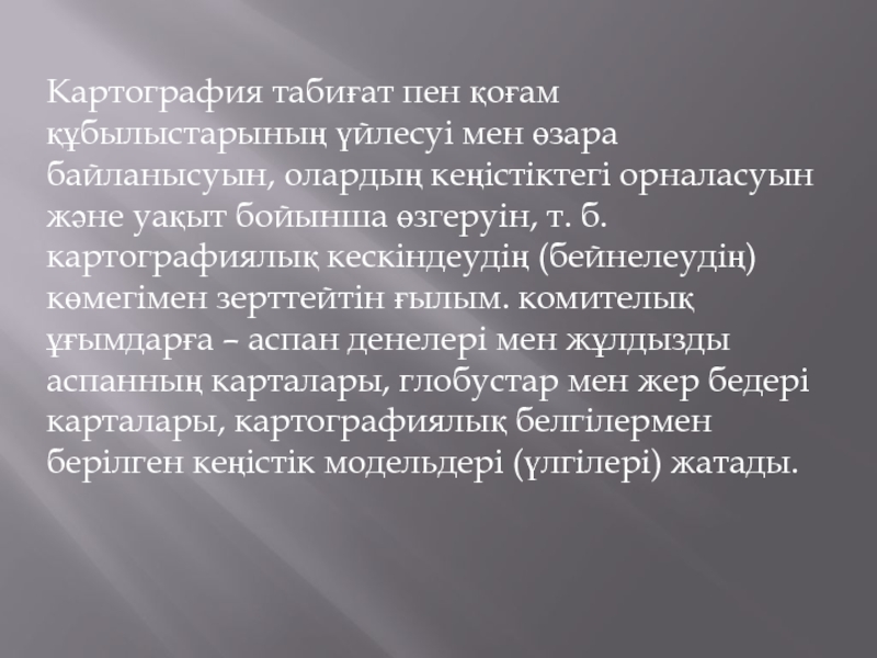 Слайд 2Картография табиғат пен қоғам құбылыстарының үйлесуі мен өзара байланысуын, олардың
