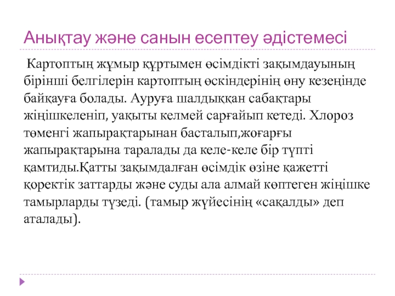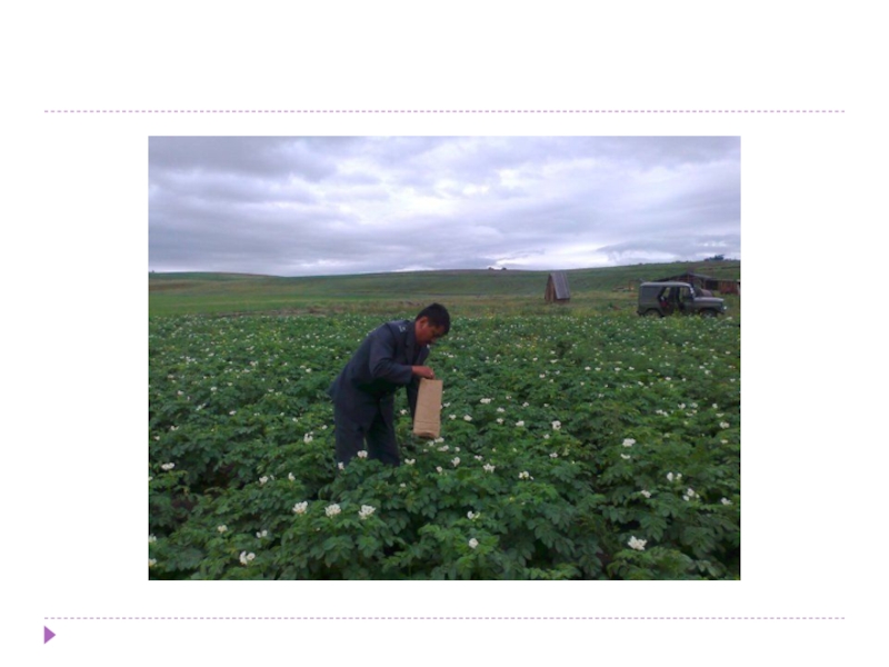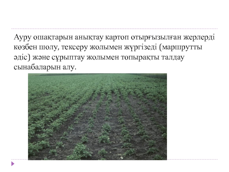 Слайд 19Ауру ошақтарын анықтау картоп отырғызылған жерлерді көзбен шолу, тексеру жолымен