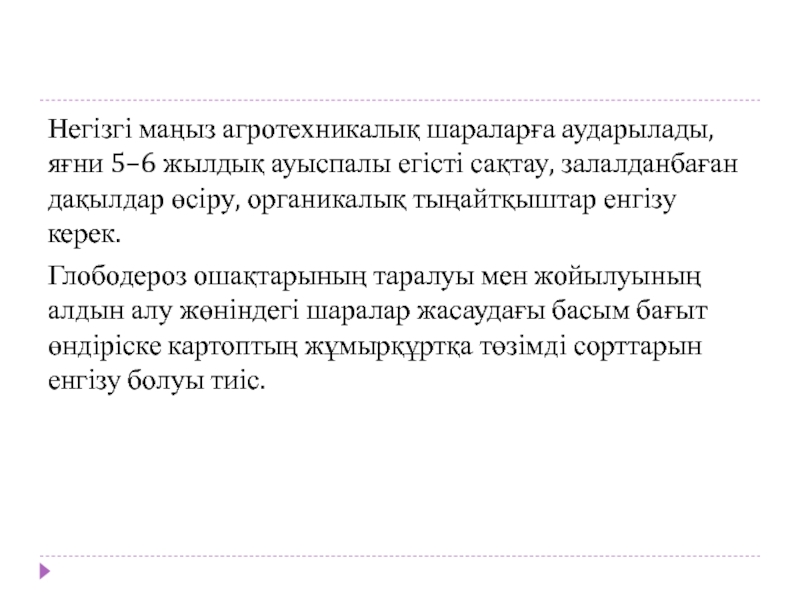 Слайд 25Негізгі маңыз агротехникалық шараларға аударылады, яғни 5–6 жылдық ауыспалы егісті
