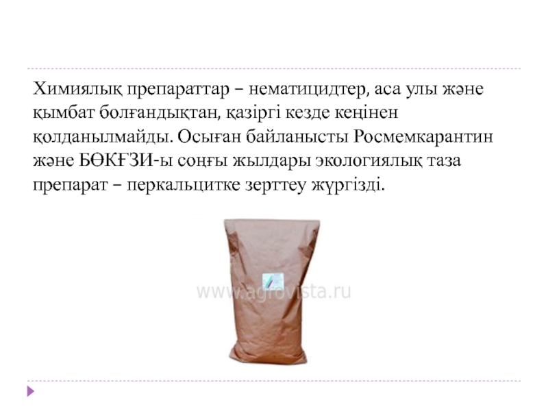 Слайд 26Химиялық препараттар – нематицидтер, аса улы және қымбат болғандықтан, қазіргі