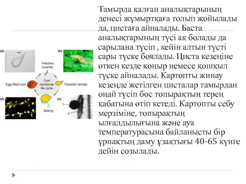 Слайд 14Тамырда қалған аналықтарының денесі жұмыртқаға толып жойылады да, цистаға айналады.