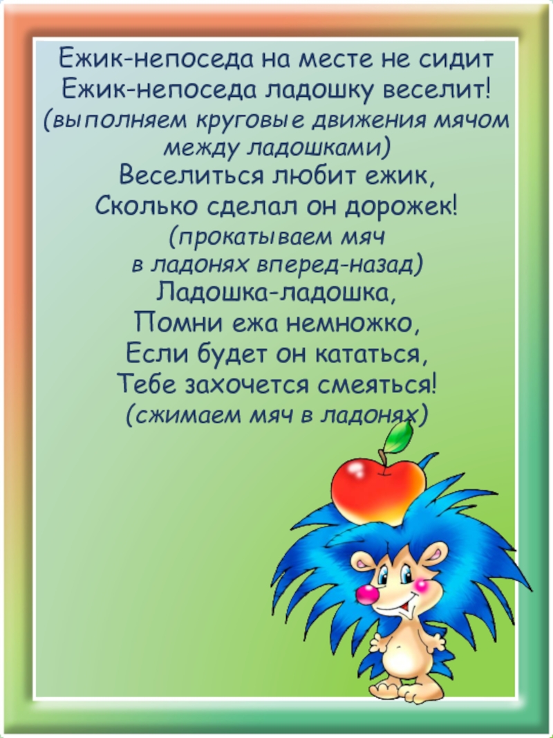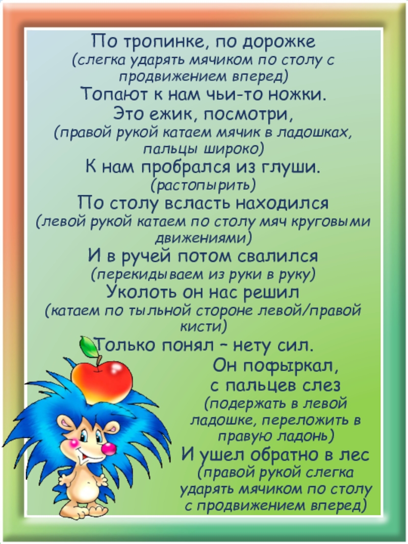 (все движения выполняются в соответствии с текстом, ежика гладим, чешем щекочем. на слова « по тропке убежал» мячик можно катать по столу, коленкам)