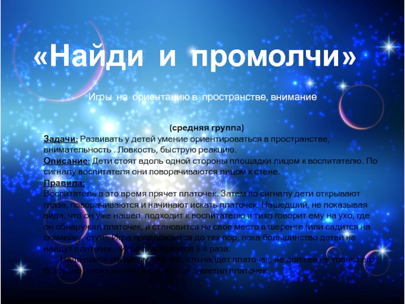 Воспитатель в это время прячет платочек. Затем по сигналу дети открывают глаза, поворачиваются и начинают искать платочек. Нашедший, не показывая вида, что он уже нашел, подходит к воспитателю и тихо говорит ему на ухо, где он обнаружил платочек, и становится на свое место в шеренге (или садится на скамейку, стул). Игра продолжается до тех пор, пока большинство детей не найдут платочек. Игра повторяется 3-4 раза.