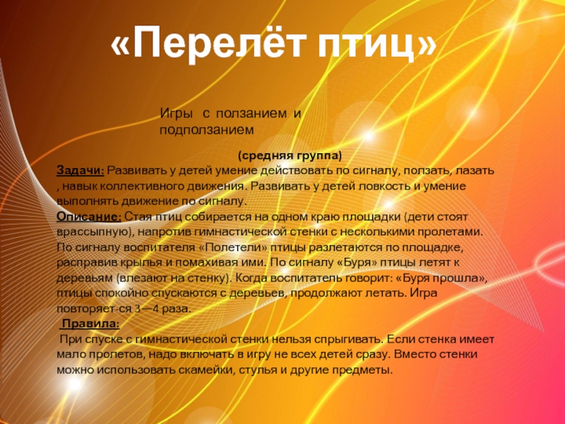 Описание: Стая птиц собирается на одном краю площадки (дети стоят врассыпную), напротив гимнастической стенки с несколькими пролетами. По сигналу воспитателя «Полетели» птицы разлетаются по площадке, расправив крылья и помахивая ими. По сигналу «Буря» птицы летят к деревьям (влезают на стенку). Когда воспитатель говорит: «Буря прошла», птицы спокойно спускаются с деревьев, продолжают летать. Игра повторяет-ся 3—4 раза.