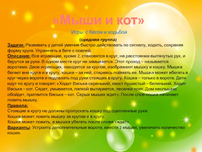 Правила: Дети останавливаются, поднимают сцепленные руки вверх, образуя ворота. Мыши вбегают в мышеловку и выбегают из неё. По сигналу воспитателя «Хлоп» стоящие по кругу дети опускают руки, приседают – мышеловка захлопывается. Мыши, не успевшие выбежать из круга (мышеловки), считаются пойманными. Пойманные становятся в круг, мышеловка увеличивается. Когда большая часть детей поймана, дети меняются ролями, и игра возобновляется. Игра повторяется 4-5 раз.
