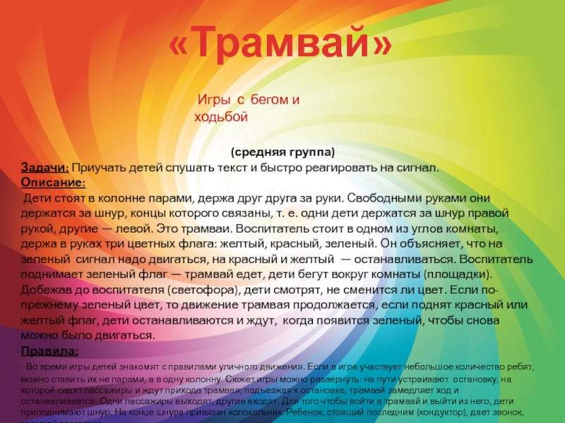 Дети стоят в колонне парами, держа друг друга за руки. Свободными руками они держатся за шнур, концы которого связаны, т. е. одни дети держатся за шнур правой рукой, другие — левой. Это трамваи. Воспитатель стоит в одном из углов комнаты, держа в руках три цветных флага: желтый, красный, зеленый. Он объясняет, что на зеленый сигнал надо двигаться, на красный и желтый — останавливаться. Воспитатель поднимает зеленый флаг — трамвай едет, дети бегут вокруг комнаты (площадки). Добежав до воспитателя (светофора), дети смотрят, не сменится ли цвет. Если по-прежнему зеленый цвет, то движение трамвая продолжается, если поднят красный или желтый флаг, дети останавливаются и ждут, когда появится зеленый, чтобы снова можно было двигаться.