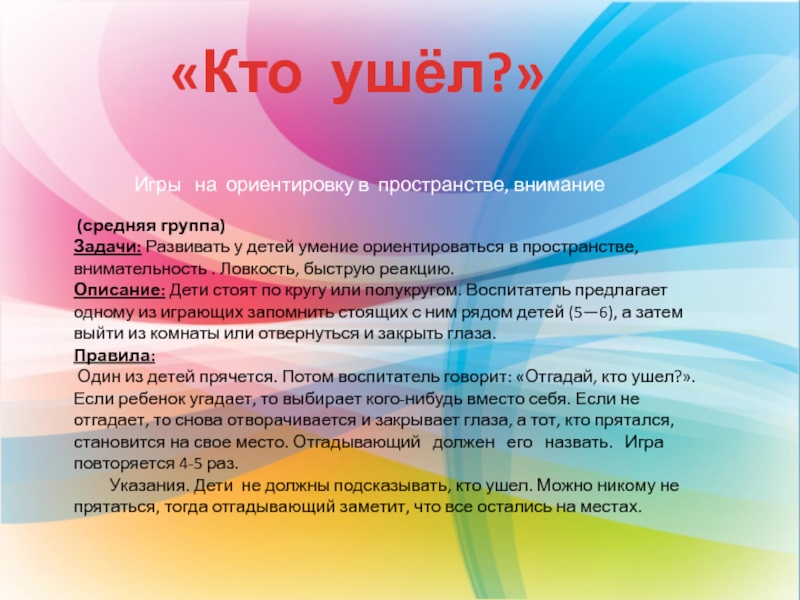 Указания. Дети не должны подсказывать, кто ушел. Можно никому не прятаться, тогда отгадывающий заметит, что все остались на местах.