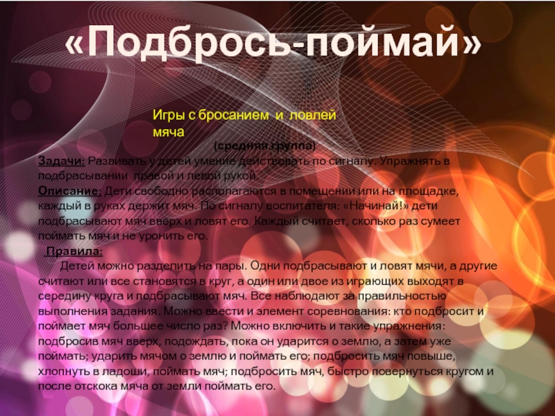 Описание: Дети свободно располагаются в помещении или на площадке, каждый в руках держит мяч. По сигналу воспитателя: «Начинай!» дети подбрасывают мяч вверх и ловят его. Каждый считает, сколько раз сумеет поймать мяч и не уронить его.