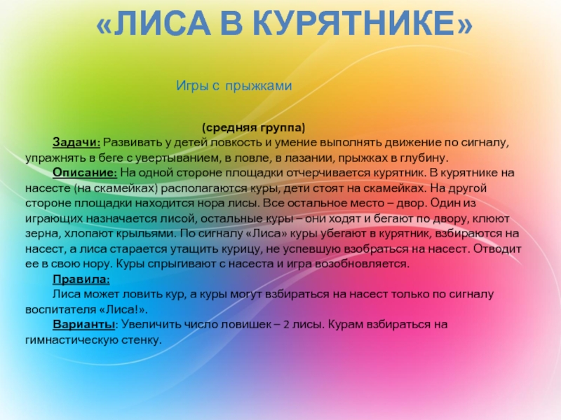 Описание: На одной стороне площадки отчерчивается курятник. В курятнике на насесте (на скамейках) располагаются куры, дети стоят на скамейках. На другой стороне площадки находится нора лисы. Все остальное место – двор. Один из играющих назначается лисой, остальные куры – они ходят и бегают по двору, клюют зерна, хлопают крыльями. По сигналу «Лиса» куры убегают в курятник, взбираются на насест, а лиса старается утащить курицу, не успевшую взобраться на насест. Отводит ее в свою нору. Куры спрыгивают с насеста и игра возобновляется.