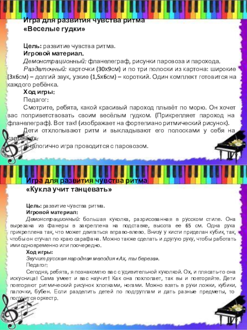 Сегодня, ребята, я познакомлю вас с удивительной куколкой. Ох, и плясать-то она искусница! Сама умеет и вас научит! Как она похлопает, так вы и повторяйте. Дети повторяют ритмический рисунок хлопками, ногами. Можно взять в руки ложки, кубики, палочки, бубен. Если разделить детей по подгруппам и дать разные предметы, то получится оркестр.