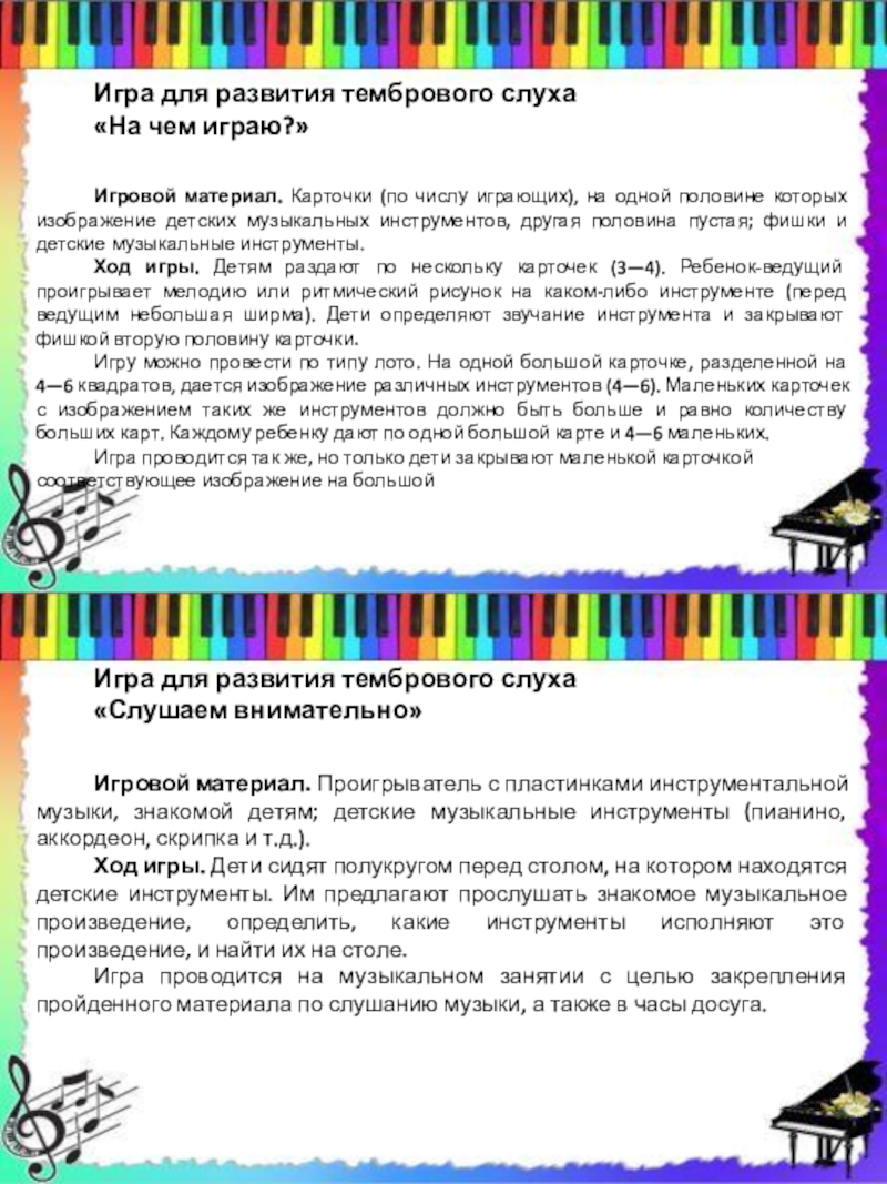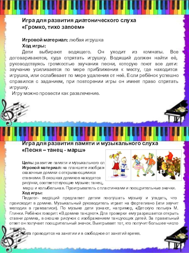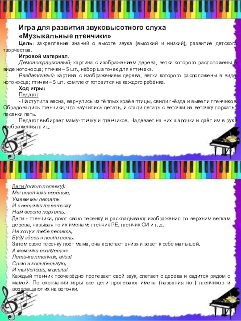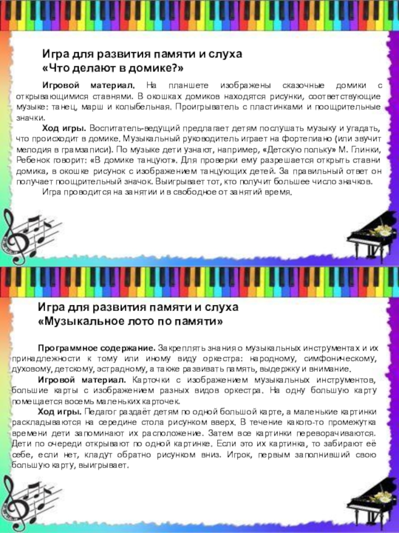 Первый и второй варианты игры используются на музыкальных занятиях в разделе слушания и пения. Третий вариант обыгрывается детьми самостоятельно в свободное от занятий время.