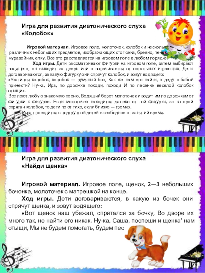 Ход игры. Ребенок-ведущий исполняет на любом инструменте мелодию, другой ребенок определяет движение мелодии вверх, вниз или на одном звуке и соответственно передвигает игрушку (например, зайчика) по ступенькам лесенки вверх, вниз или постукивает на одной ступеньке. Следующий ребенок действует другой игрушкой.