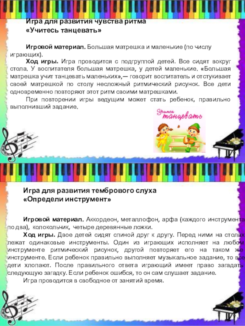 Ход игры. Двое детей сидят спиной друг к другу. Перед ними на столах лежат одинаковые инструменты. Один из играющих исполняет на любом инструменте ритмический рисунок, другой повторяет его на таком же инструменте. Если ребенок правильно выполняет музыкальное задание, то все дети хлопают. После правильного ответа играющий имеет право загадать следующую загадку. Если ребенок ошибся, то он сам слушает задание.