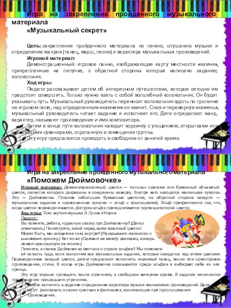 Игровой материал: Демонстрационный: цветок — тюльпан оригами или бумажный объемный цветок, лепестки которого разрезаны и соединены наверху. Внутри него находится маленькая куколка. Это — Дюймовочка. Плоские небольшие бумажные цветочки, на обратной стороне каждого — музыкальное задание и нарисованная куколка — эльф с крылышками). Эльф прикрепляется так, что, когда цветок переворачивается, фигурка эльфа приподнимается перпендикулярно цветку.