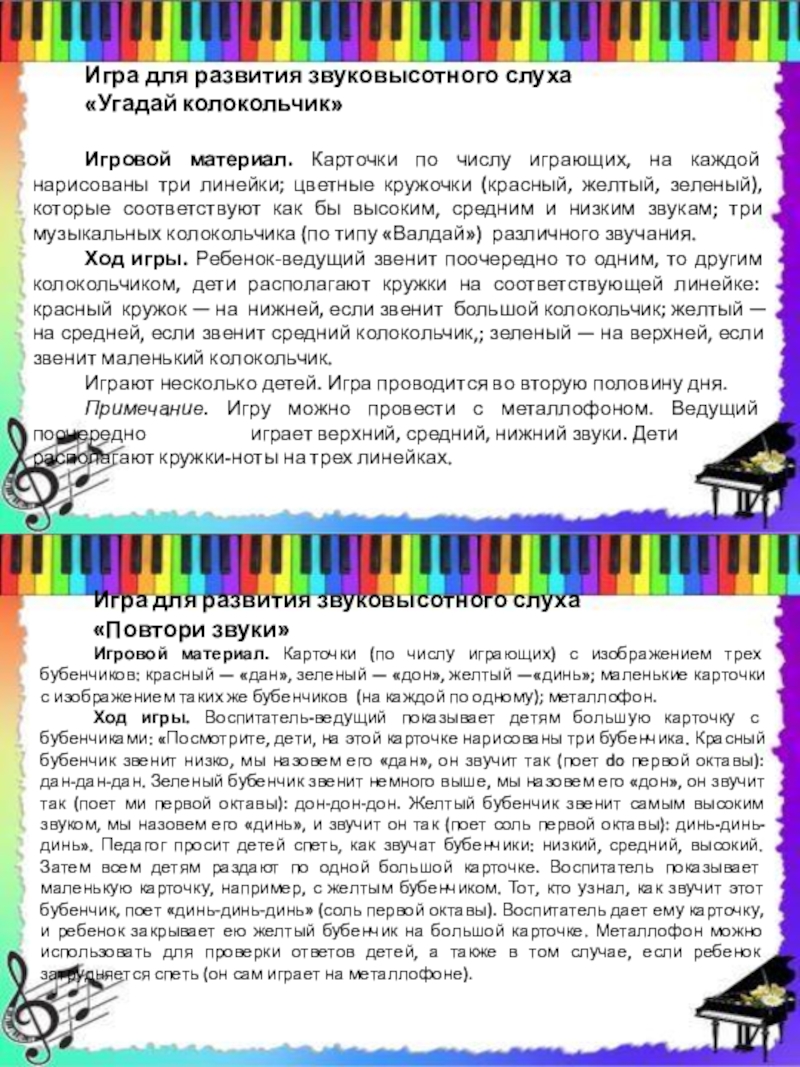 Ход игры. Воспитатель-ведущий показывает детям большую карточку с бубенчиками: «Посмотрите, дети, на этой карточке нарисованы три бубенчика. Красный бубенчик звенит низко, мы назовем его «дан», он звучит так (поет do первой октавы): дан-дан-дан. Зеленый бубенчик звенит немного выше, мы назовем его «дон», он звучит так (поет ми первой октавы): дон-дон-дон. Желтый бубенчик звенит самым высоким звуком, мы назовем его «динь», и звучит он так (поет соль первой октавы): динь-динь-динь». Педагог просит детей спеть, как звучат бубенчики: низкий, средний, высокий. Затем всем детям раздают по одной большой карточке. Воспитатель показывает маленькую карточку, например, с желтым бубенчиком. Тот, кто узнал, как звучит этот бубенчик, поет «динь-динь-динь» (соль первой октавы). Воспитатель дает ему карточку, и ребенок закрывает ею желтый бубенчик на большой карточке. Металлофон можно использовать для проверки ответов детей, а также в том случае, если ребенок затрудняется спеть (он сам играет на металлофоне).