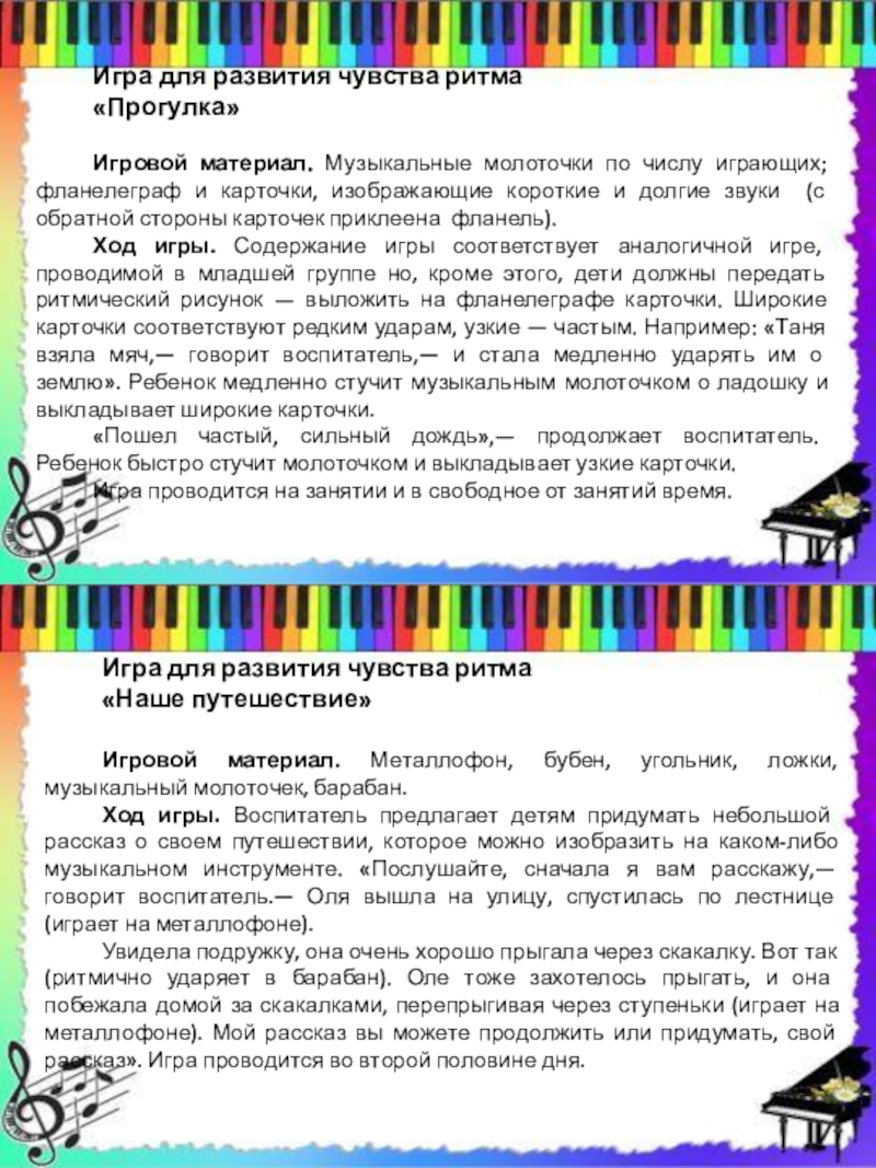 Увидела подружку, она очень хорошо прыгала через скакалку. Вот так (ритмично ударяет в барабан). Оле тоже захотелось прыгать, и она побежала домой за скакалками, перепрыгивая через ступеньки (играет на металлофоне). Мой рассказ вы можете продолжить или придумать, свой рассказ». Игра проводится во второй половине дня.
