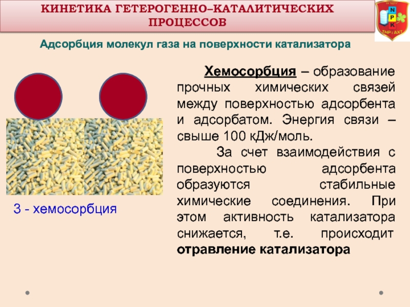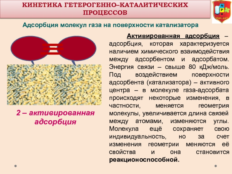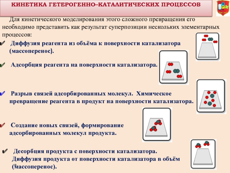 Разрыв связей адсорбированных молекул. Химическое превращение реагента в продукт на поверхности катализатора.