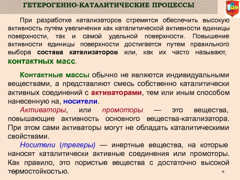 Контактные массы обычно не являются индивидуальными веществами, а представляют смесь собственно каталитически активных соединений с активаторами, тем или иным способом нанесенную на, носители.