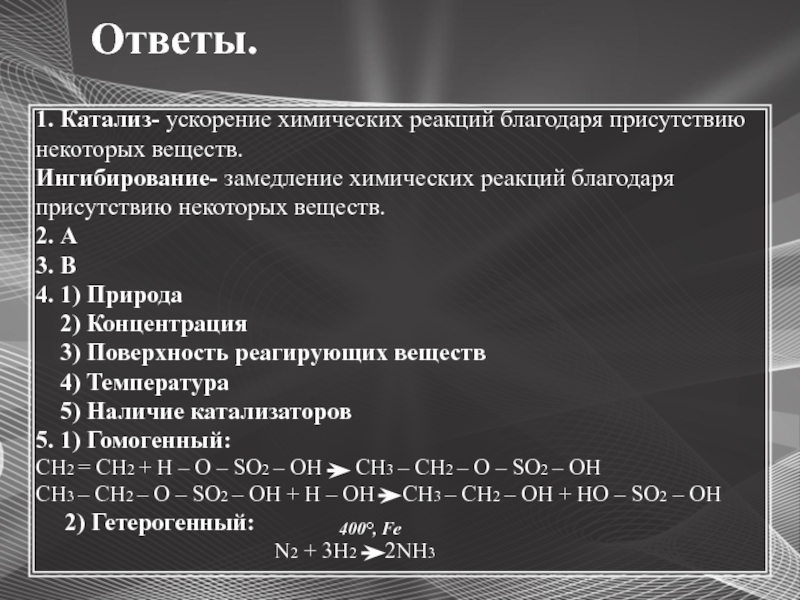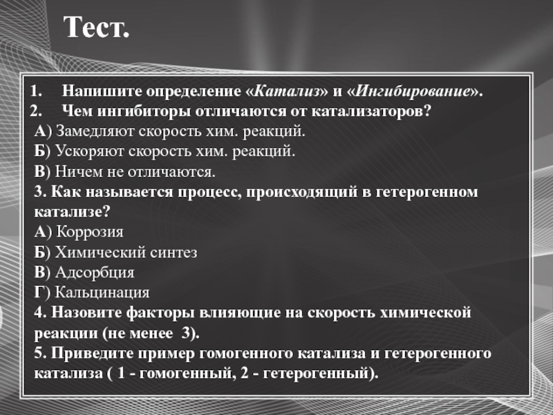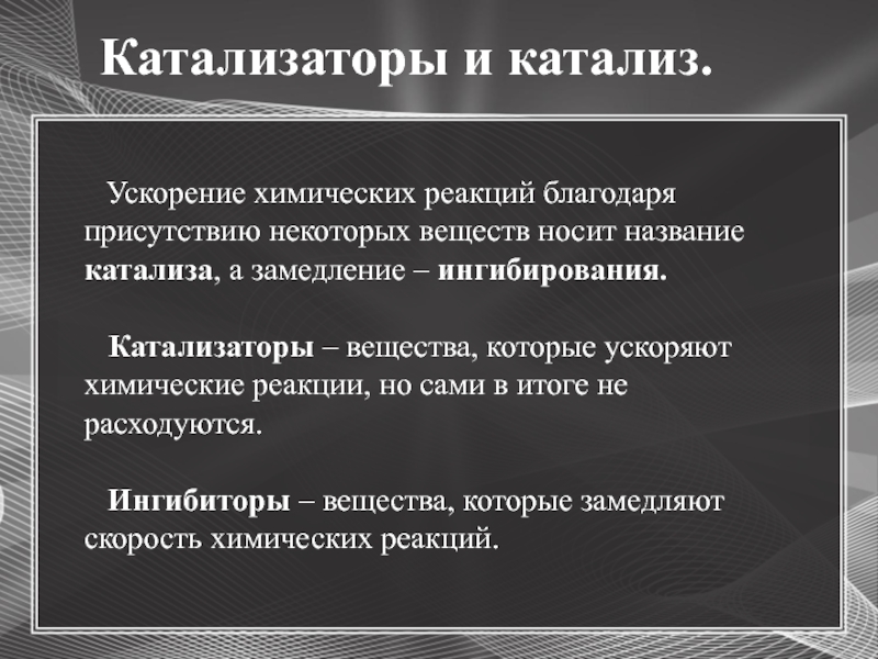 – вещества, которые ускоряют химические реакции, но сами в итоге не расходуются.Ингибиторы – вещества, которые замедляют скорость химических реакций.