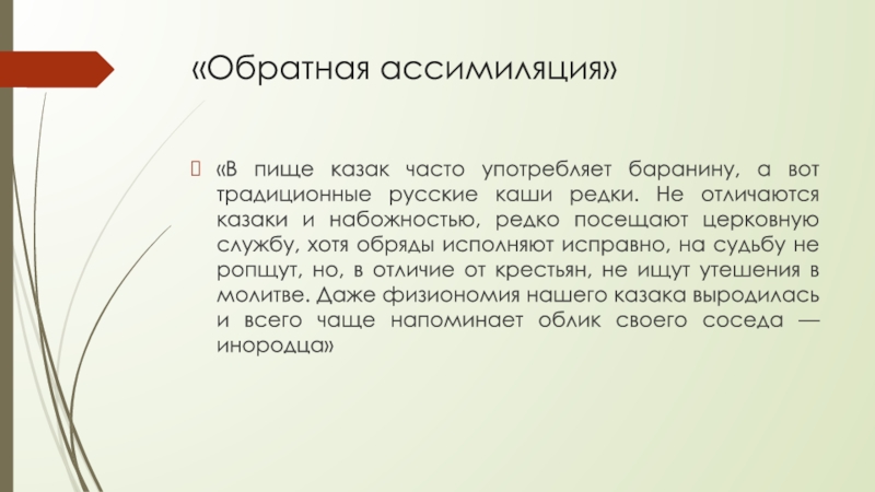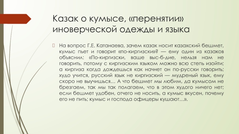 Слайд 7Казак о кумысе, «перенятии» иноверческой одежды и языка