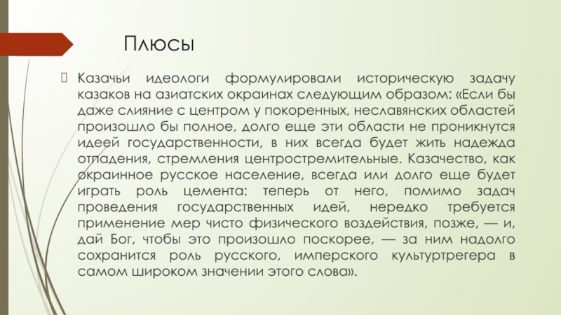 областей произошло бы полное, долго еще эти области не проникнутся идеей государственности, в них всегда будет жить надежда отпадения, стремления центростремительные. Казачество, как окраинное русское население, всегда или долго еще будет играть роль цемента: теперь от него, помимо задач проведения государственных идей, нередко требуется применение мер чисто физического воздействия, позже, — и, дай Бог, чтобы это произошло поскорее, — за ним надолго сохранится роль русского, имперского культуртрегера в самом широком значении этого слова».