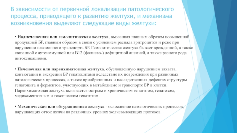 • Печеночная или паренхиматозная желтуха, обусловленную нарушением захвата, конъюгации и экскреции БР гепатоцитами вследствие их повреждения при различных патологических процессах, а также приобретенных и наследственных дефектах структуры гепатоцита и ферментов, участвующих в метаболизме и транспорте БР в клетки. Паренхиматозная желтуха вызывается острым и хроническим гепатитом, гепатозом, медикаментозным и токсическим гепатитом.