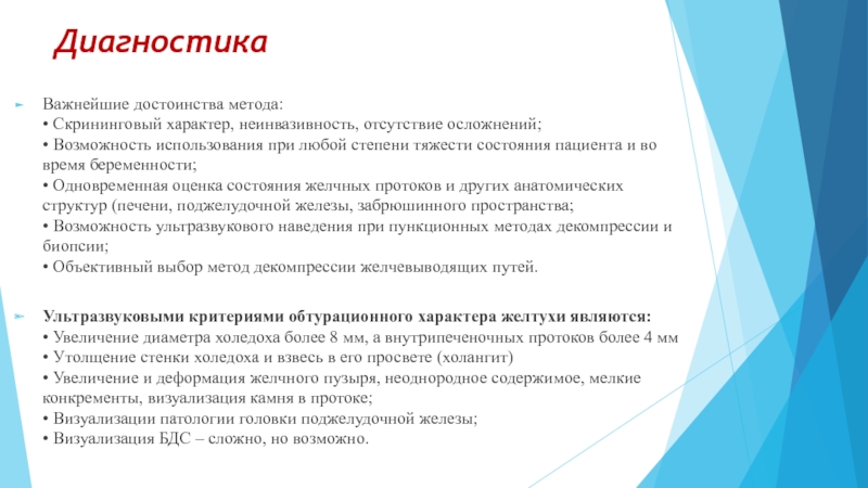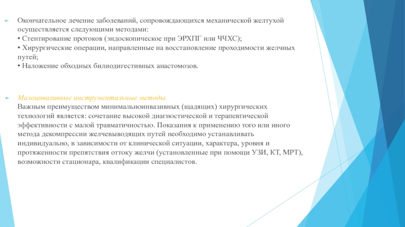 Важным преимуществом минимальноинвазивных (щадящих) хирургических технологий является: сочетание высокой диагностической и терапевтической эффективности с малой травматичностью. Показания к применению того или иного метода декомпрессии желчевыводящих путей необходимо устанавливать индивидуально, в зависимости от клинической ситуации, характера, уровня и протяженности препятствия оттоку желчи (установленные при помощи УЗИ, КТ, МРТ), возможности стационара, квалификации специалистов.
