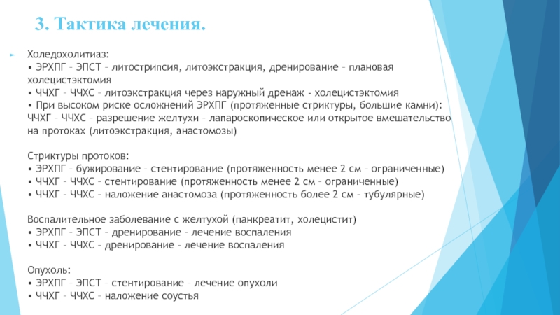 • При высоком риске осложнений ЭРХПГ (протяженные стриктуры, большие камни): ЧЧХГ – ЧЧХС – разрешение желтухи – лапароскопическое или открытое вмешательство на протоках (литоэкстракция, анастомозы)