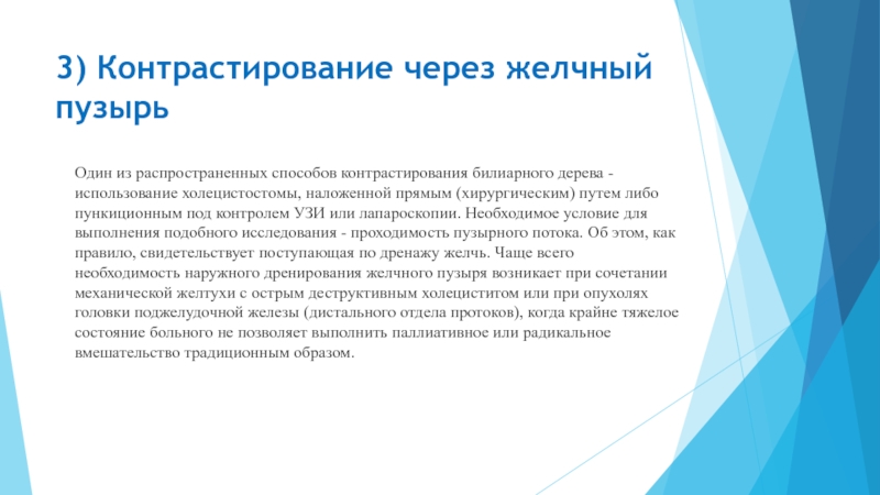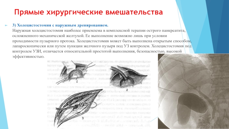 возможно лишь при условии проходимости пузырного протока. Холецистостомия может быть выполнена открытым способом, лапароскопически или путем пункции желчного пузыря под УЗ контролем. Холецистостомия под контролем УЗИ, отличается относительной простотой выполнения, безопасностью, высокой эффективностью.