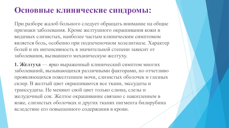 1. Желтуха — ярко выраженный клинический симптом многих заболеваний, вызывающихся различными факторами, но отчетливо проявляющихся пожелтением мочи, слизистых оболочек и глазных склер. В желтый цвет окрашиваются все ткани, экссудаты и транссудаты. Не меняют свой цвет только слюна, слезы и желудочный сок. Желтое окрашивание связано с накоплением в коже, слизистых оболочках и других тканях пигмента билирубина вследствие его повышенного содержания в крови.